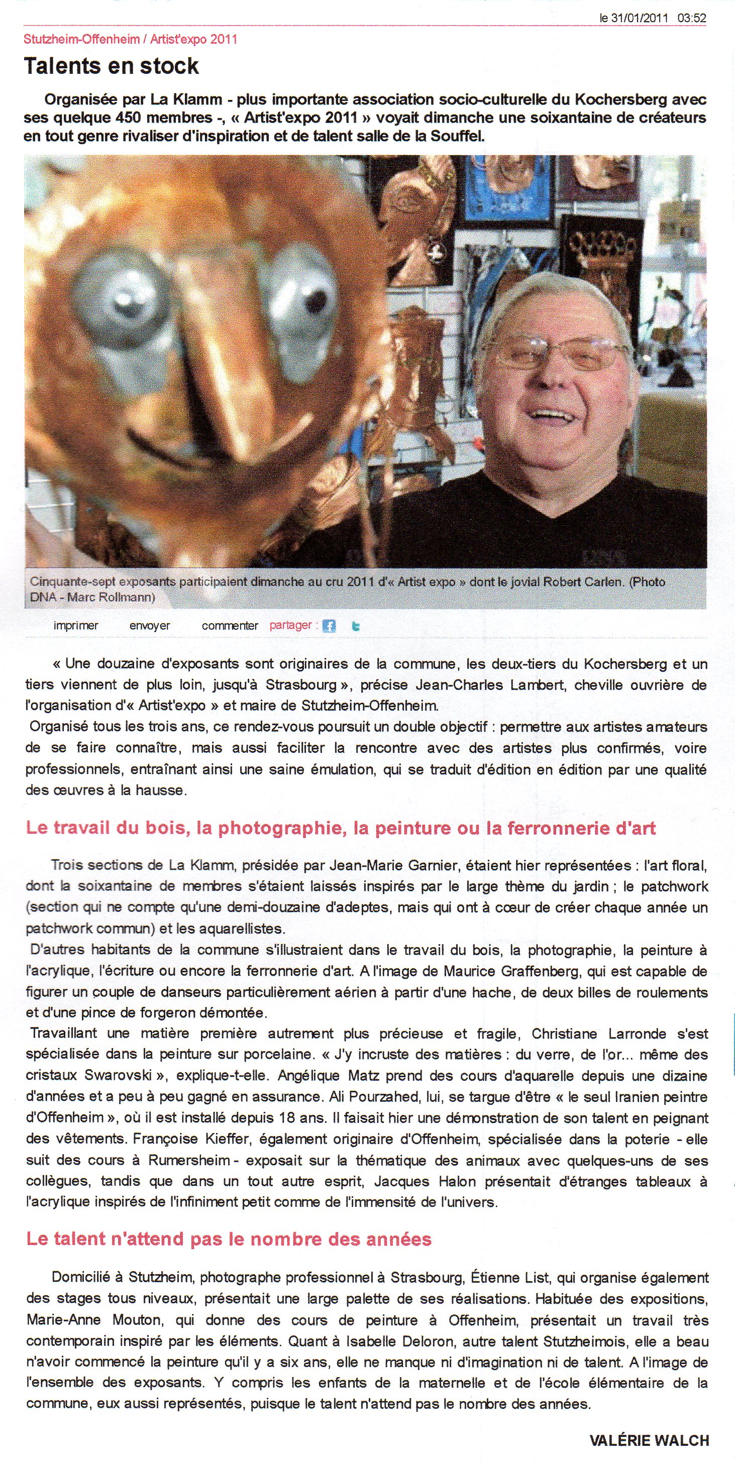 Organisée par La Klamm - plus importante association socio-culturelle du Kochersberg avec ses quelque 450 membres-,« Artist'expo 2011 » voyait dimanche une soixantaine de créateurs en tout genre rivaliser d'inspiration et de talent salle de la Souffel.